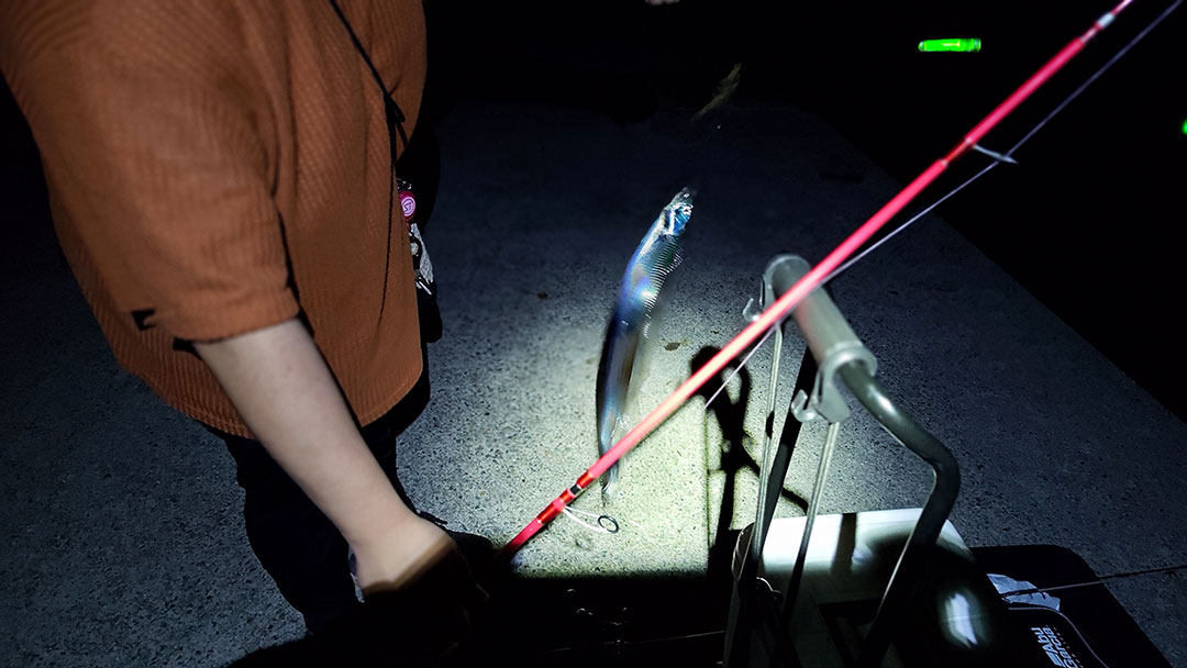 タチウオは3匹くらい釣れたんだけど、2匹はリリースサイズの小さいやつ。